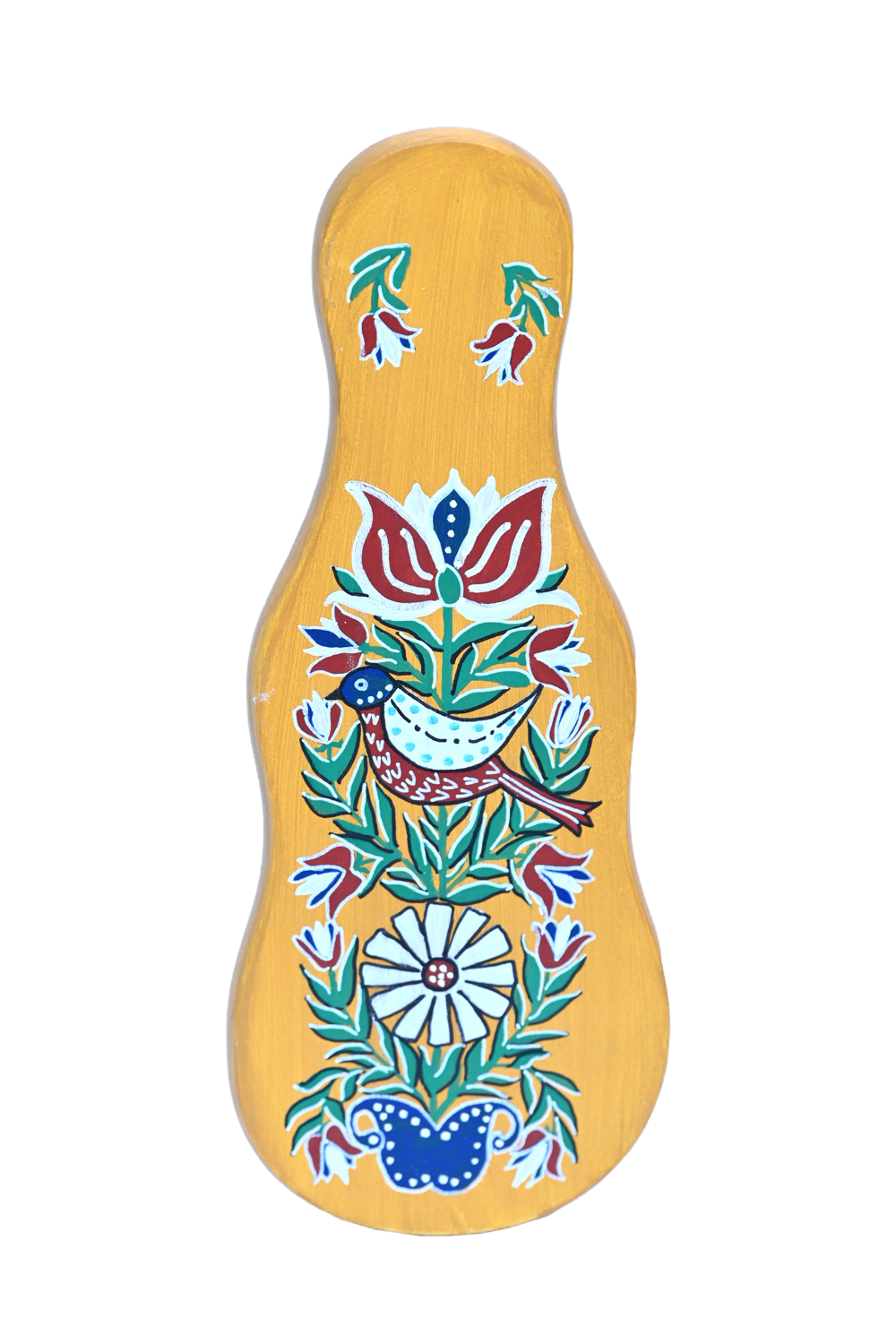 Pictură pe lemn, modelul ornamentului este aplicat pe un blat de lemn vălurit. Culorile folosite sunt culori de bază, folosite în tehnica tradițională veche, respectiv roșu, alb, verde pe un fundal ocru. Motivele sunt florale si zoomorfe. Poate fi folosit ca tablou de lemn. Realizat în culori Vitex, atât fundalul cât și desenul. Pictura este lacuită cu un lac transparent satinat ce conferă un aspect mătăsos, cu durabilitate bună, chiar dacă este expusă la soare sau umiditate.