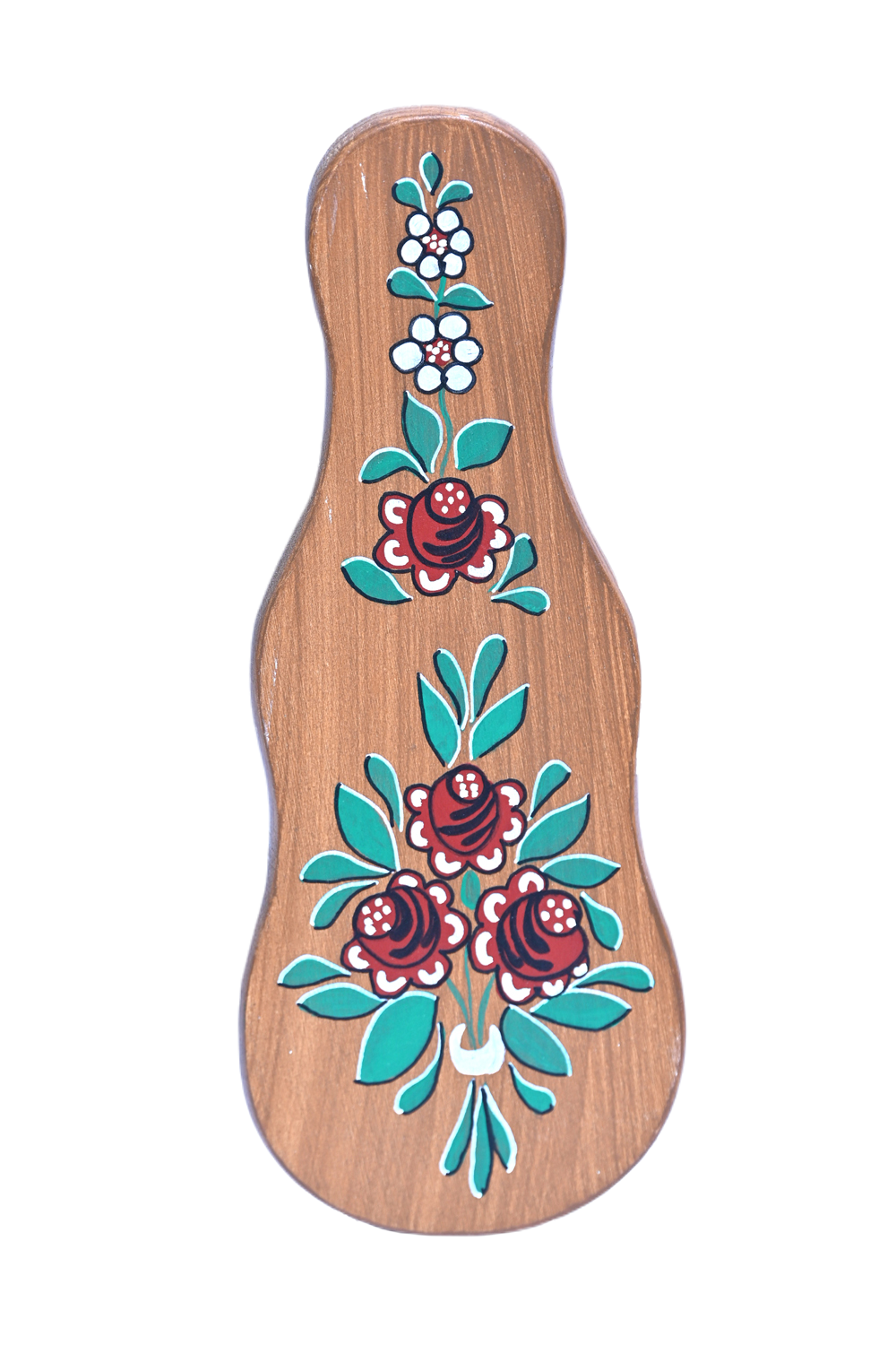 Pictură pe lemn, modelul ornamentului este aplicat pe un blat de lemn vălurit. Culorile folosite sunt culori de bază, folosite în tehnica tradițională veche, respectiv roșu, alb, verde pe un fundal maro. Motivele sunt florale. Poate fi folosit ca tablou decorativ. Realizat în culori Vitex, atât fundalul cât și desenul. Pictura este lacuită cu un lac transparent satinat ce conferă un aspect mătăsos, cu durabilitate bună, chiar dacă este expusă la soare sau umiditate.