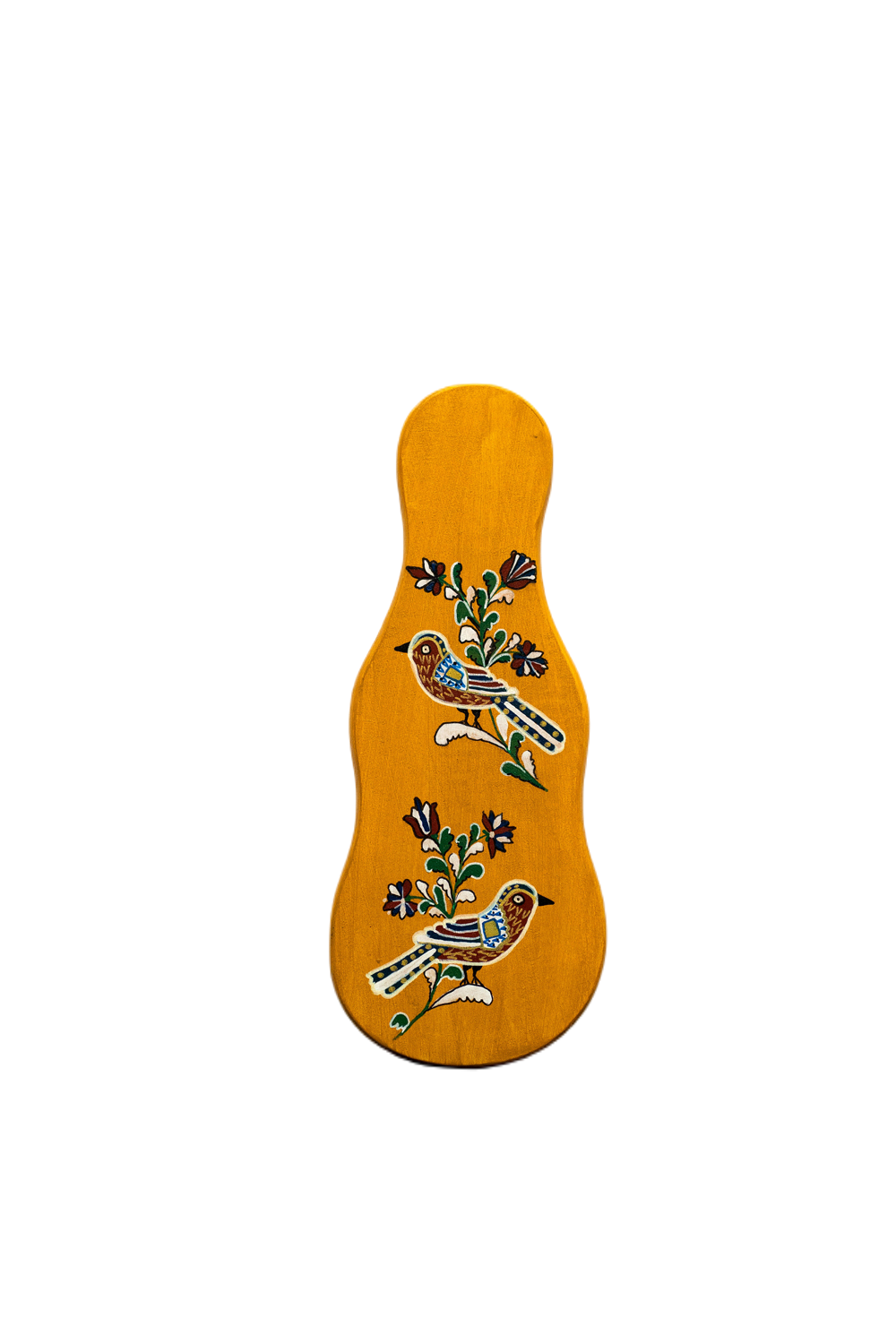 Pictură pe lemn, modelul ornamentului este aplicat pe un blat de lemn vălurit. Culorile folosite sunt culori de bază, folosite în tehnica tradițională veche, respectiv roșu, alb, verde pe un fundal ocru. Motivele sunt florale si zoomorfe. Poate fi folosit ca tablou decorativ. Realizat în culori Vitex, atât fundalul cât și desenul. Pictura este lacuită cu un lac transparent satinat ce conferă un aspect mătăsos, cu durabilitate bună, chiar dacă este expusă la soare sau umiditate.
