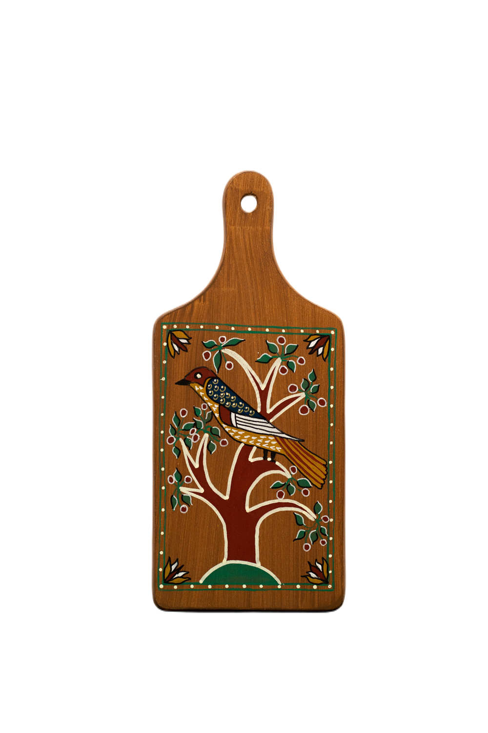 Pictură pe lemn, modelul ornamentului este aplicat pe un tocator/blat lemn – dreptunghiular. Culorile folosite sunt culori de bază, folosite în tehnica tradițională veche, respectiv roșu, alb, verde pe un fundal maro. Motivele sunt florale si zoomorfe inspirate din arta Fraktur – o artă germano-americană timpurie, putin cunoscuta pentru unii, dar iubită de cei care i- au descoperit frumusețea, cu lucrări realizate în cerneală. Poate fi folosit ca tablou decorativ. Realizat în culori Vitex, atât fundalul cât și desenul. Pictura este lacuită cu un lac transparent satinat ce conferă un aspect mătăsos, cu durabilitate bună, chiar dacă este expusă la soare sau umiditate.