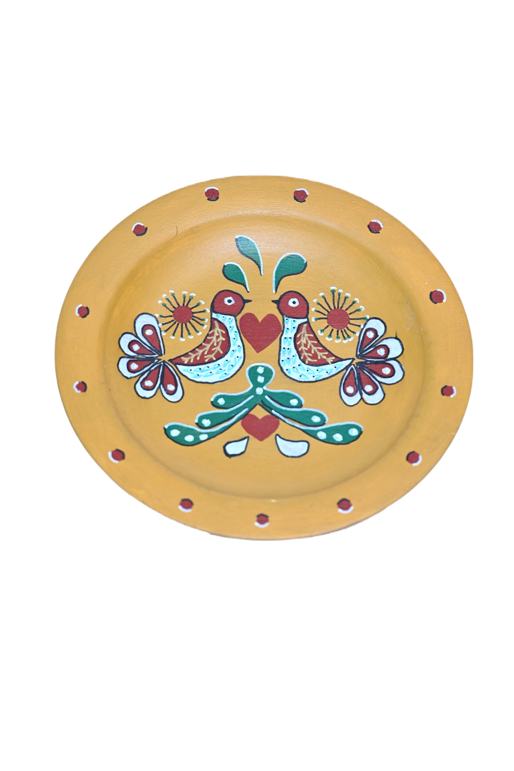 Pictură pe lemn, modelul ornamentului este aplicat pe o farfurie din lemn de fag. Culorile folosite sunt culori de bază, folosite în tehnica tradițională veche, respectiv roșu, alb, verde pe un fundal ocru. Motivele sunt florale si zoomorfe. Poate fi folosită ca tablou de lemn si expus pe perete sau pe un raft. Realizat în culori Vitex, atât fundalul cât și desenul. Pictura este lacuită cu un lac transparent satinat ce conferă un aspect mătăsos, cu durabilitate bună, chiar dacă este expusă la soare sau umiditate.