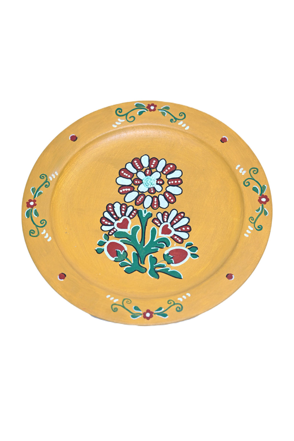 Pictură pe lemn, modelul ornamentului este aplicat pe o farfurie din lemn de fag. Culorile folosite sunt culori de bază, folosite în tehnica tradițională veche, respectiv roșu, alb, verde pe un fundal ocru. Motivele sunt florale si zoomorfe. Poate fi folosită ca tablou de lemn si expus pe perete sau pe un raft. Realizat în culori Vitex, atât fundalul cât și desenul. Pictura este lacuită cu un lac transparent satinat ce conferă un aspect mătăsos, cu durabilitate bună, chiar dacă este expusă la soare sau umiditate.