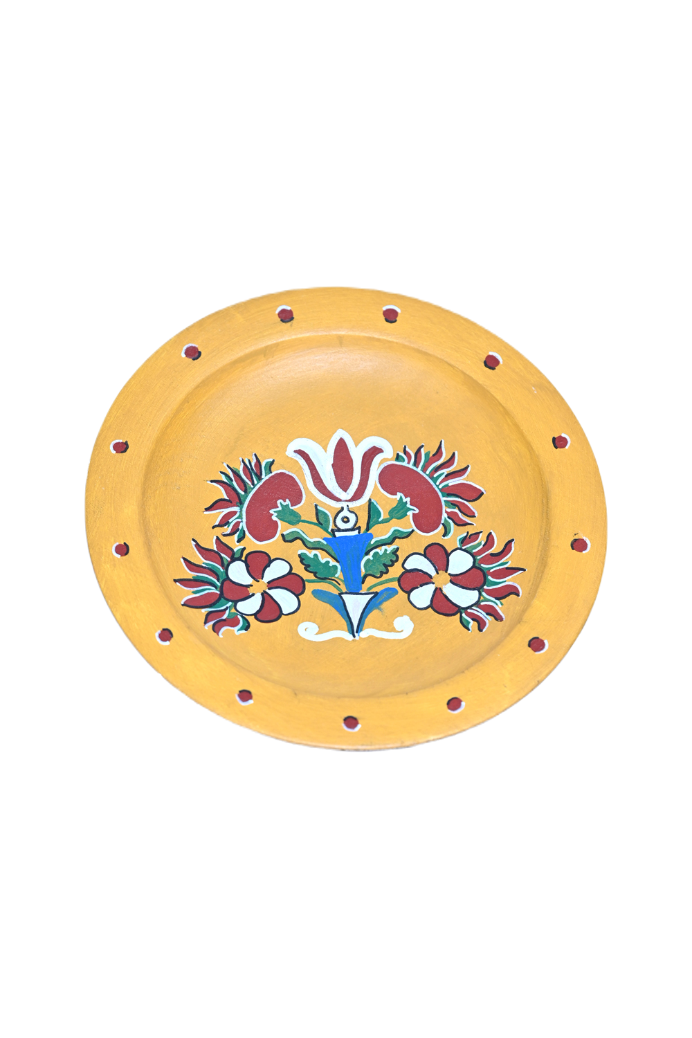 Pictură pe lemn, modelul ornamentului este aplicat pe o farfurie din lemn de fag. Culorile folosite sunt culori de bază, folosite în tehnica tradițională veche, respectiv roșu, alb, verde pe un fundal ocru. Motivele sunt florale. Poate fi folosită ca tablou de lemn si expus pe perete sau pe un raft. Realizat în culori Vitex, atât fundalul cât și desenul. Pictura este lacuită cu un lac transparent satinat ce conferă un aspect mătăsos, cu durabilitate bună, chiar dacă este expusă la soare sau umiditate.