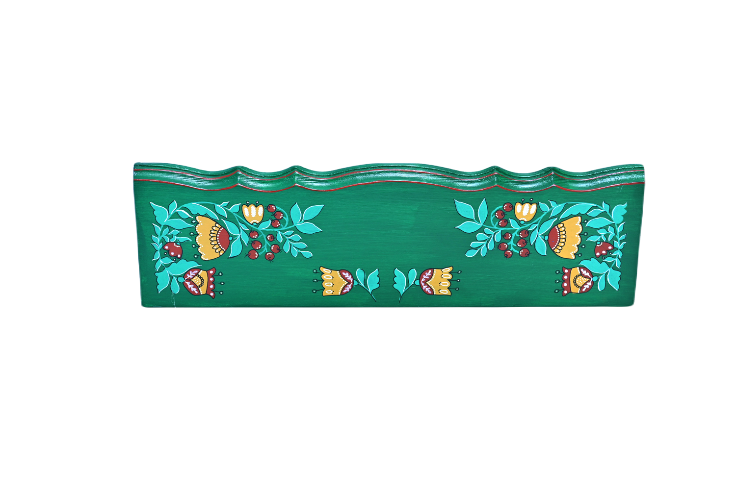 Pictură pe lemn aplicată pe o margine decorativă. Motivul este floral, culorile de bază folosite sunt ocru și alb pe fundal verde închis. Poate fi folosit ca suport de agățat obiecte de bucătărie sau chei, prin montarea unor cârlige la baza laturii de jos. Realizat în culori Vitex, atât fundalul cât și desenul. pictură este lacuită cu un lac transparent satinat ce conferă un aspect mătăsos, cu durabilitate bună, chiar dacă este expusă la soare sau umiditate.