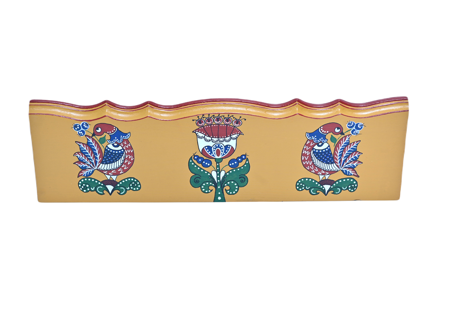 Pictură pe lemn aplicată pe o margine decorativă. Motivul este floral, zoomorf, fundal ocru. Poate fi folosit ca suport de agățat obiecte de bucătărie sau chei, prin montarea unor cârlige la baza laturii de jos. Realizat în culori Vitex, atât fundalul cât și desenul. pictură este lacuită cu un lac transparent satinat ce conferă un aspect mătăsos, cu durabilitate bună, chiar dacă este expusă la soare sau umiditate.