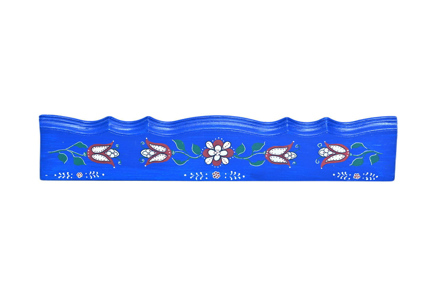 Pictură pe lemn aplicată pe o margine decorativă. Motivul este floral, culorile de bază folosite sunt roșu, alb, pe fundal albastru inchis. Poate fi folosit ca suport de agățat obiecte de bucatărie prin montarea unor cârlige la baza laturii de jos. Realizat în culori Vitex, atât fundalul cât și desenul. Pictura este lacuită cu un lac transparent satinat ce conferă un aspect mătăsos, cu durabilitate bună, chiar dacă este expusă la soare sau umiditate.