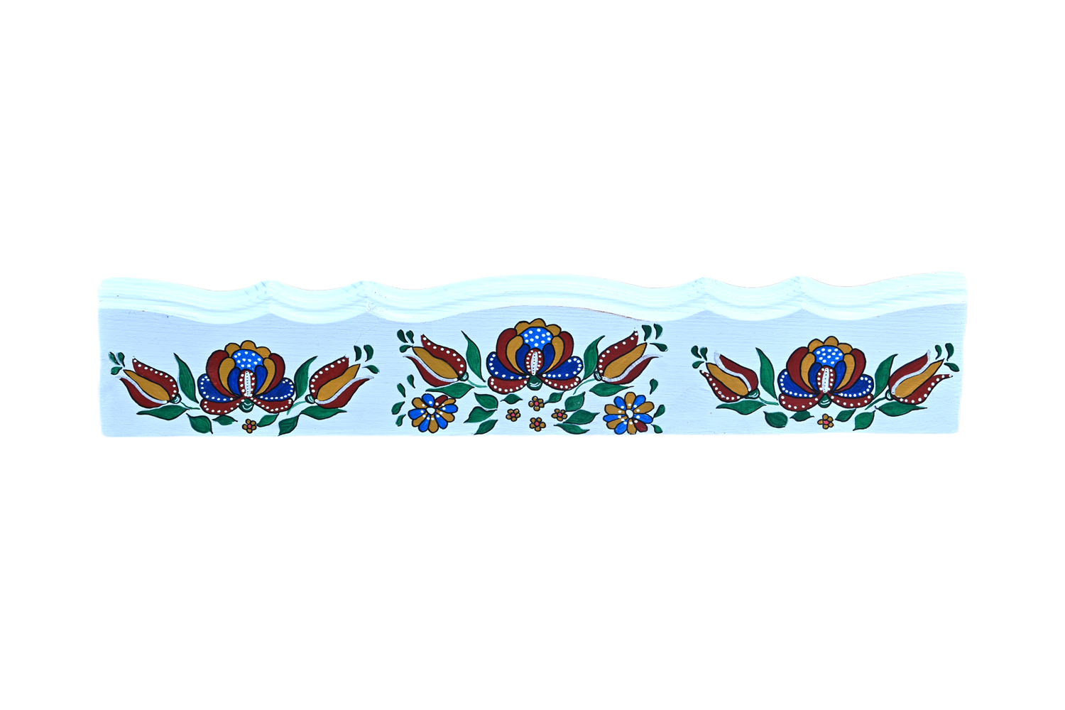 Pictură pe lemn aplicată pe o margine decorativă. Motivul este floral, culorile de bază folosite sunt roșu și galben pe fundal alb. Poate fi folosit ca suport de agățat obiecte de bucatărie prin montarea unor cârlige la baza laturii de jos. Realizat în culori Vitex, atât fundalul cât și desenul. Pictura este lăcuită cu un lac transparent satinat ce conferă un aspect mătăsos, cu durabilitate bună, chiar dacă este expusă la soare sau umiditate.