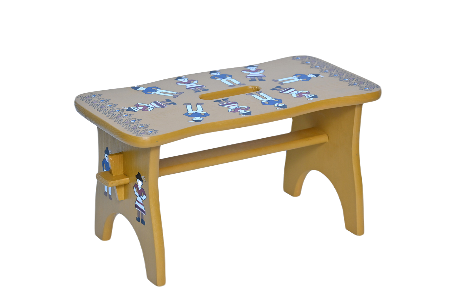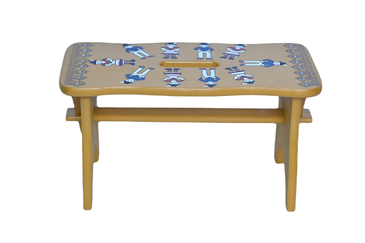 Pictură pe lemn, modelul ornamentului este aplicat pe un scaun tip taburet. Culorile folosite sunt culori de bază, folosite în tehnica tradițională veche, respectiv roșu, alb, negru pe un fundal ocru. Motivele sunt antropomorfe. Este pictat și pe lateral. Se folosește ca atare sau ca obiect de decor. Realizat în culori Vitex, atât fundalul cât și desenul. Pictura este lacuită cu un lac transparent satinat ce conferă un aspect mătăsos, cu durabilitate bună, chiar dacă este expusă la soare sau umiditate.