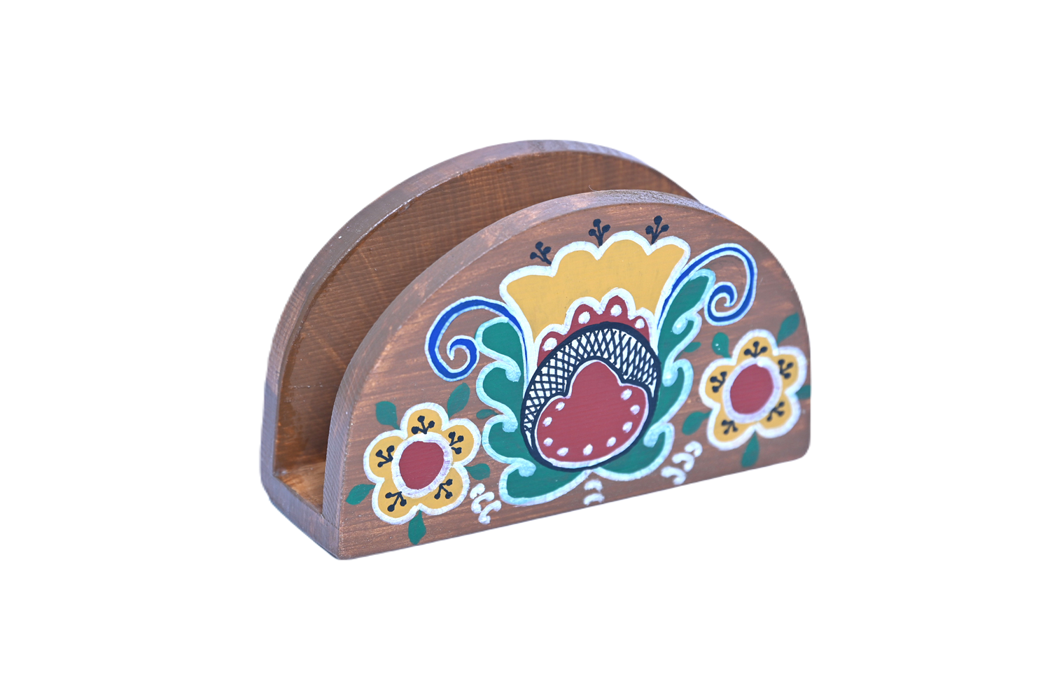 Pictură pe lemn, modelul ornamentului este aplicat pe un suport de servețele în formă de semicerc. Culorile folosite sunt culori de bază, folosite în tehnica tradițională veche, respectiv roșu, alb, verde pe un fundal maro. Motivul este floral. Poate primi utilitate practică și folosit ca suport de șervețele sau ca obiect decorativ. Realizat în culori Vitex, atât fundalul cât și desenul. Pictura este lacuită cu un lac transparent satinat ce conferă un aspect mătăsos, cu durabilitate bună, chiar dacă este expusă la soare sau umiditate.