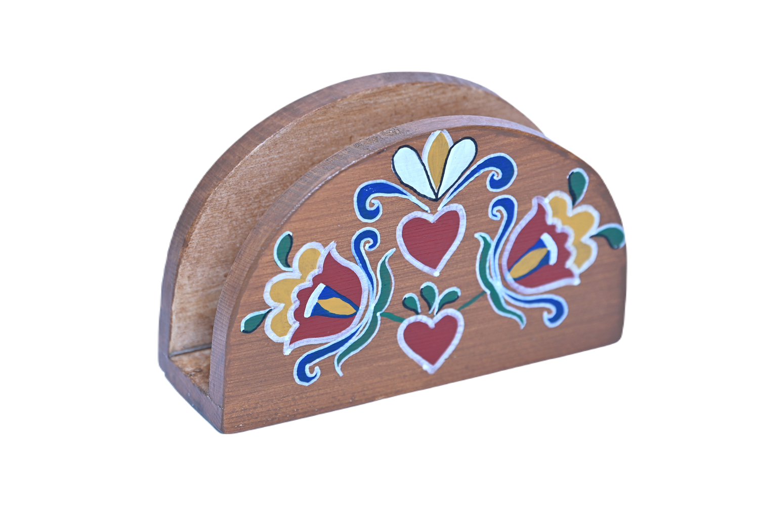 Pictură pe lemn, modelul ornamentului este aplicat pe un suport de servețele în formă de semicerc. Culorile folosite sunt culori de bază, folosite în tehnica tradițională veche, respectiv roșu, alb, verde pe un fundal maro. Motivul este floral. Poate primi utilitate practică și folosit ca suport de șervețele sau ca obiect decorativ. Realizat în culori Vitex, atât fundalul cât și desenul. Pictura este lacuită cu un lac transparent satinat ce conferă un aspect mătăsos, cu durabilitate bună, chiar dacă este expusă la soare sau umiditate.