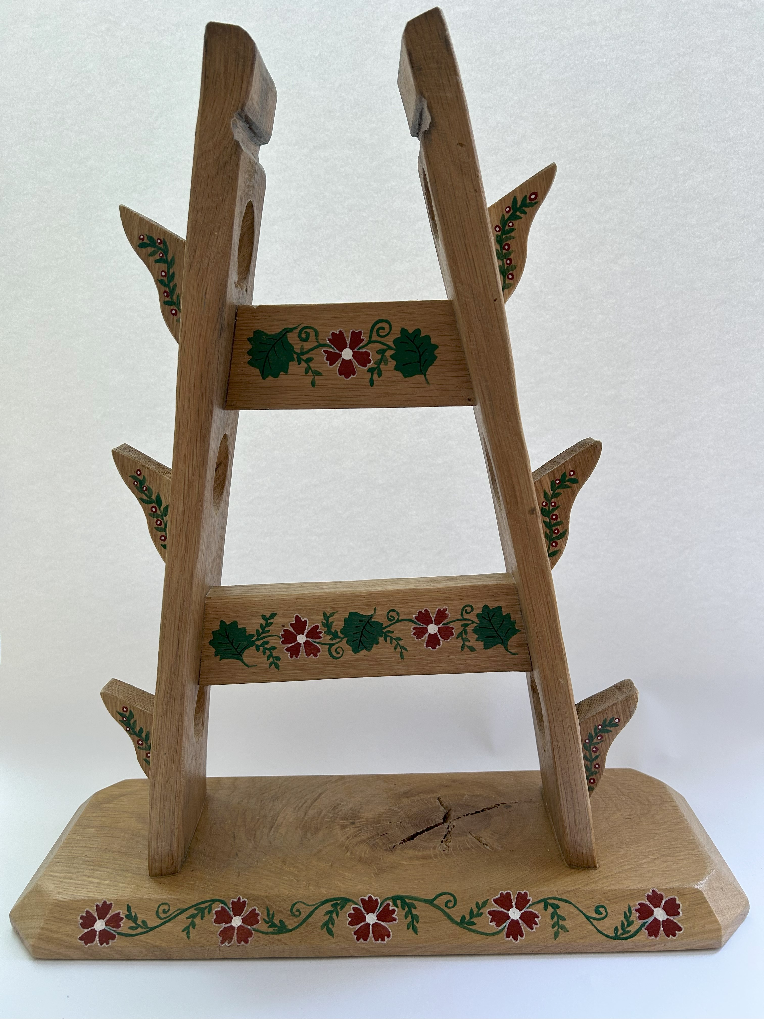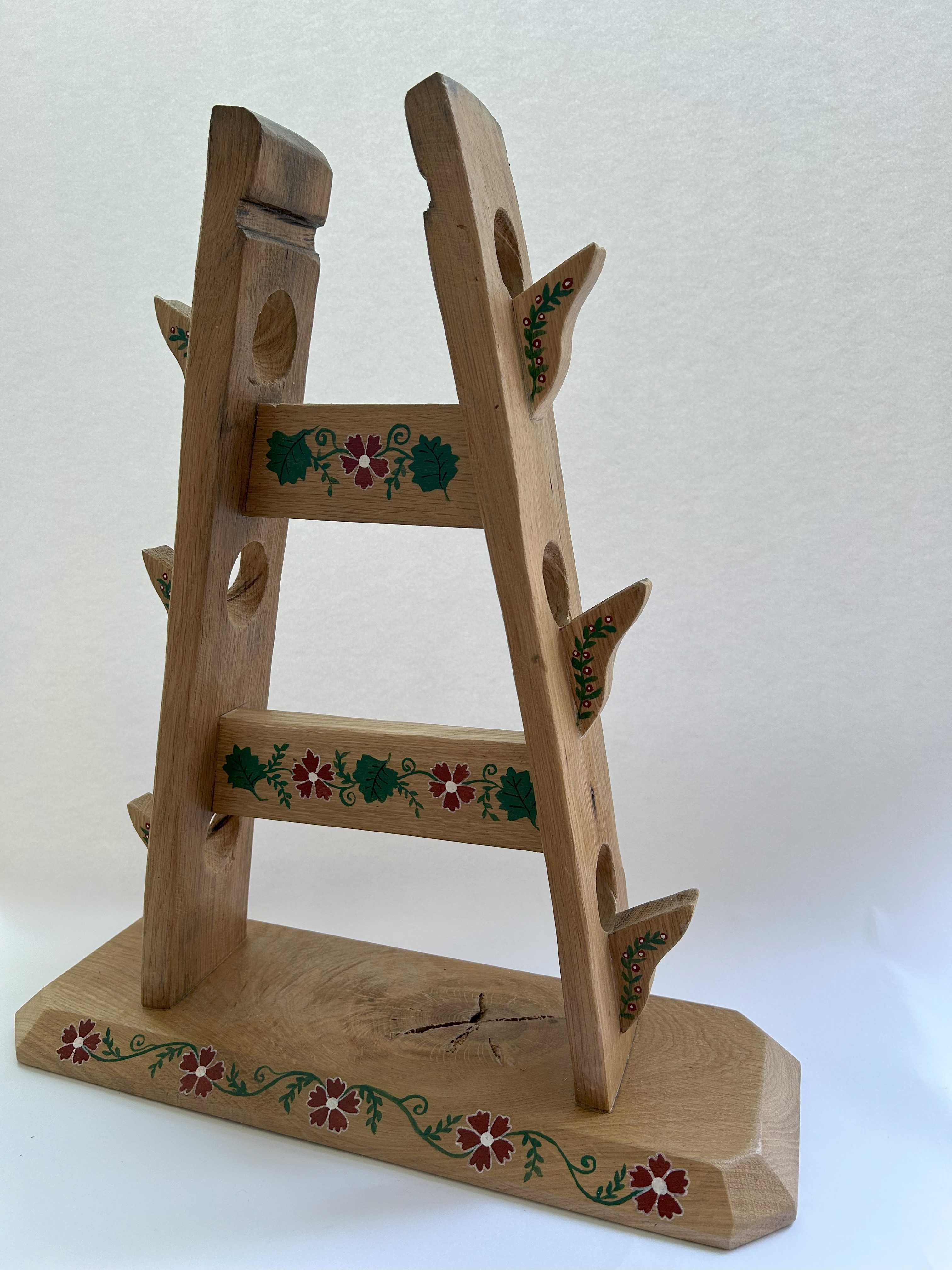 Pictură pe lemn aplicata pe un suport de sticle de vin realizat din doage de butoi de stejar. Produs unicat. Lucrat manual.Culorile folosite sunt verde, roșu, alb. Motivele sunt florale. Incap șase sticle de vin, câte trei pe fiecare latura a suportului. Pictura e realizata în culori Vitex, lacuită cu un lac transparent satinat ce conferă un aspect mătăsos, cu durabilitate bună, chiar dacă este expus la soare sau umiditate.