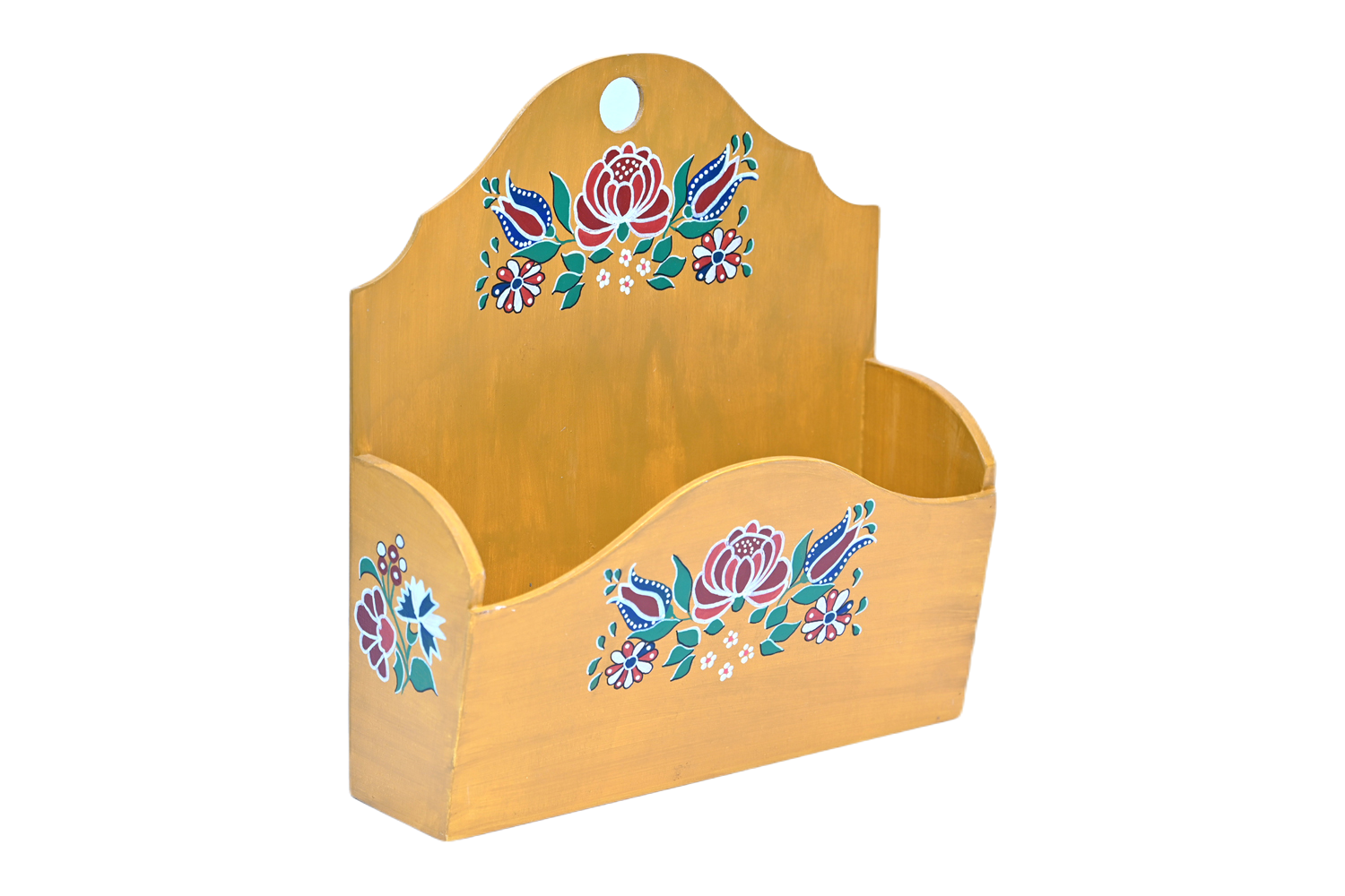 Pictură pe lemn, modelul ornamentului este aplicat pe un suport lemn pentru ziare. Culorile folosite sunt culori de bază, folosite în tehnica tradițională veche, respectiv roșu, verde, albastru pe un fundal ocru. Motivele sunt florale. Este pictat și pe lateral. Poate fi folosit ca suport de depozitat ziare și/sau reviste. Realizat în culori Vitex, atât fundalul cât și desenul. Pictura este lacuită cu un lac transparent satinat ce conferă un aspect mătăsos, cu durabilitate bună, chiar dacă este expusă la soare sau umiditate.