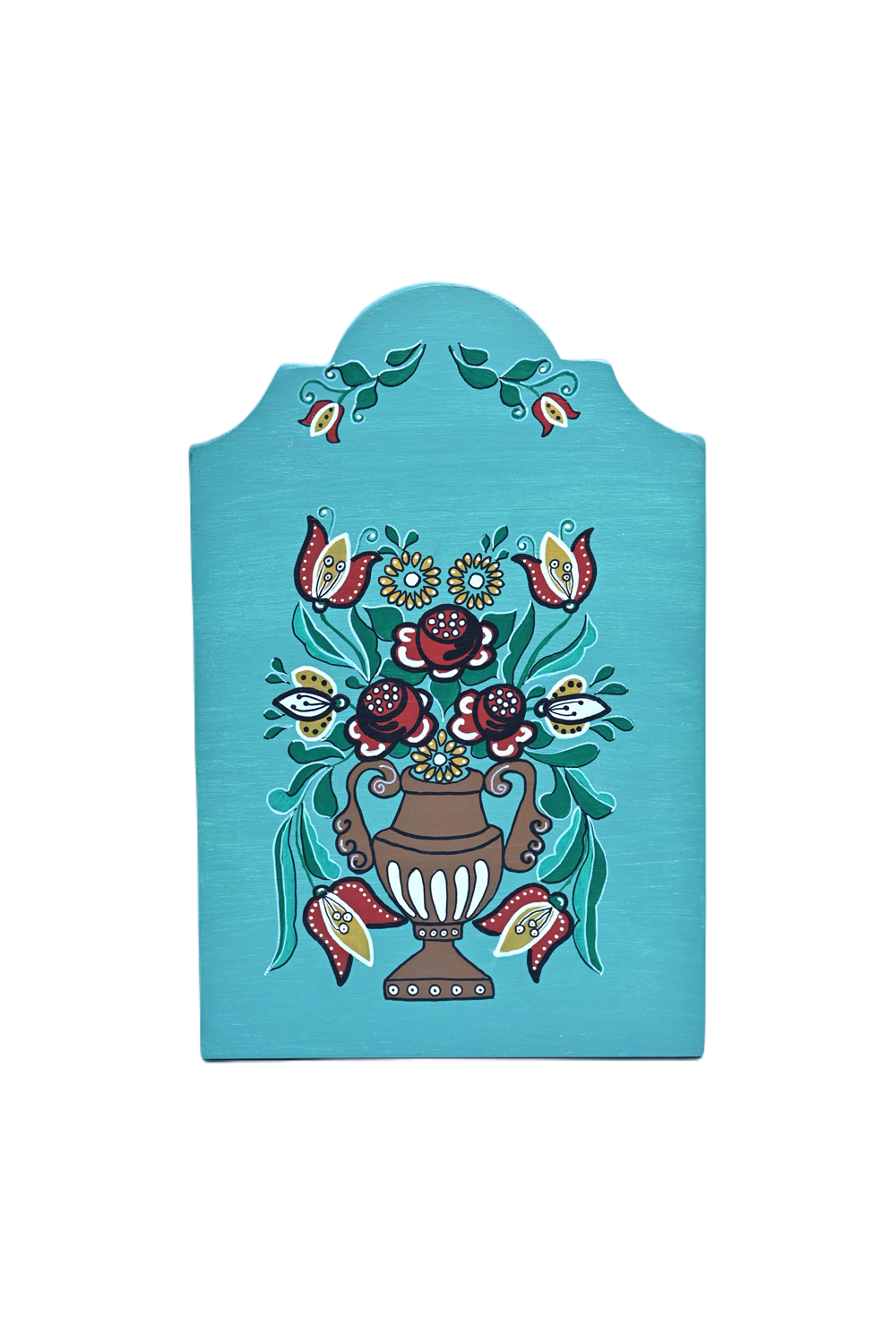 Pictură pe lemn, modelul ornamentului folosește culorile de bază, folosite în tehnica tradițională veche, respectiv roșu, galben, verde, albastru pe fundal bleu. Motivele sunt florale. Poate fi folosit ca tablou de lemn. Realizat în culori Vitex, atât fundalul cât și desenul. Pictura este lacuită cu un lac transparent satinat ce conferă un aspect mătăsos, cu durabilitate bună, chiar dacă este expusă la soare sau umiditate.