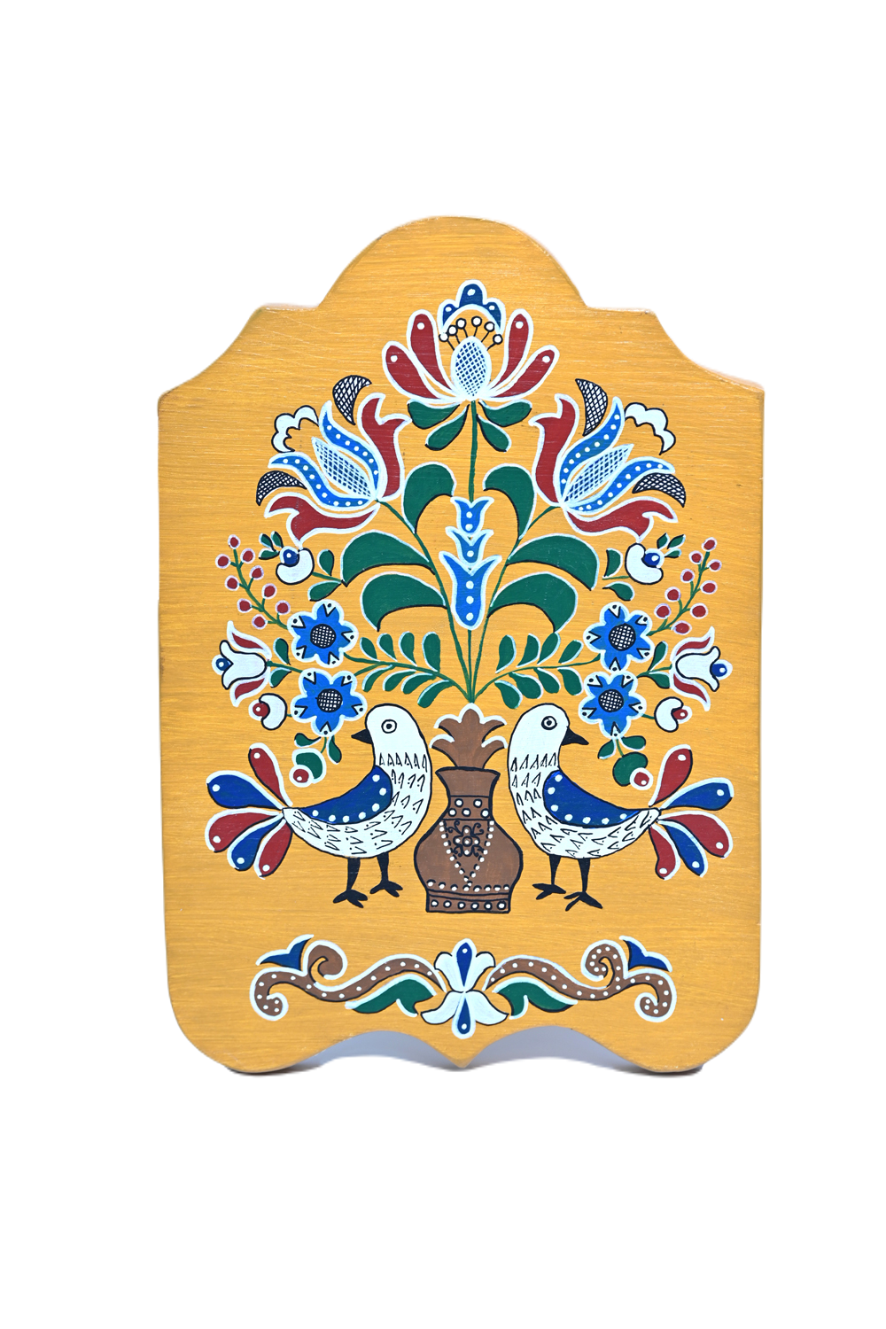 Pictură pe lemn, modelul ornamentului folosește culorile de bază, folosite în tehnica tradițională veche, respectiv roșu, galben, verde, albastru pe fundal ocru, inspirat din arta populară ungurească. Motivele sunt florale și zoomorfe. Poate fi folosit ca tablou de lemn. Realizat în culori Vitex, atât fundalul cât și desenul. pictură este lacuită cu un lac transparent satinat ce conferă un aspect mătăsos, cu durabilitate bună, chiar dacă este expusă la soare sau umiditate.