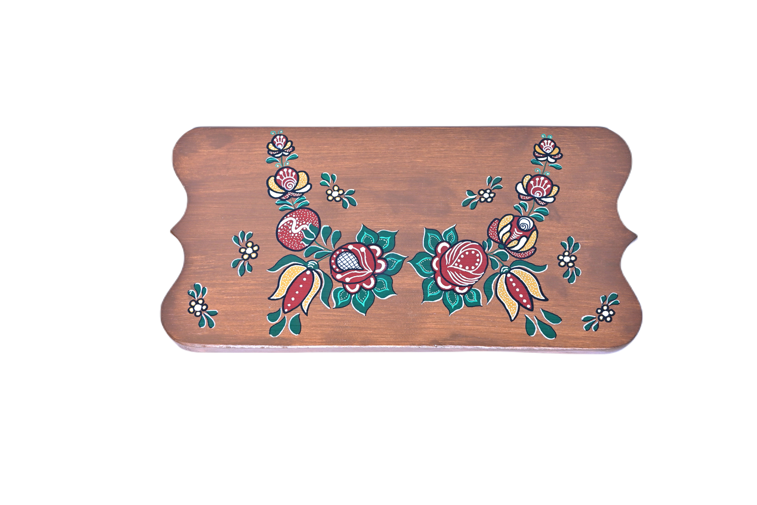 Pictură pe lemn, modelul ornamentului folosește culorile de bază, folosite în tehnica tradițională veche, respectiv roșu, galben, pe fundal maro. Motivele sunt florale, contur inspirat din modele de broderie. Realizat în culori Vitex, atât fundalul cât și desenul. Pictura este lacuită cu un lac transparent satinat ce conferă un aspect mătăsos, cu durabilitate bună, chiar dacă este expusă la soare sau umiditate.