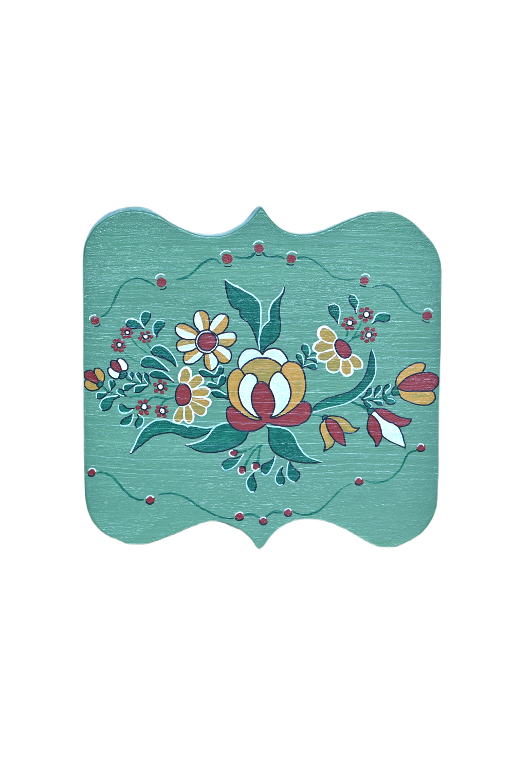 Pictură pe lemn, modelul ornamentului folosește culorile de bază, folosite în tehnica tradițională veche, respectiv roșu, galben, verde, albastru pe fundal verde. Motivele sunt florale. Poate fi folosit ca tablou de lemn.