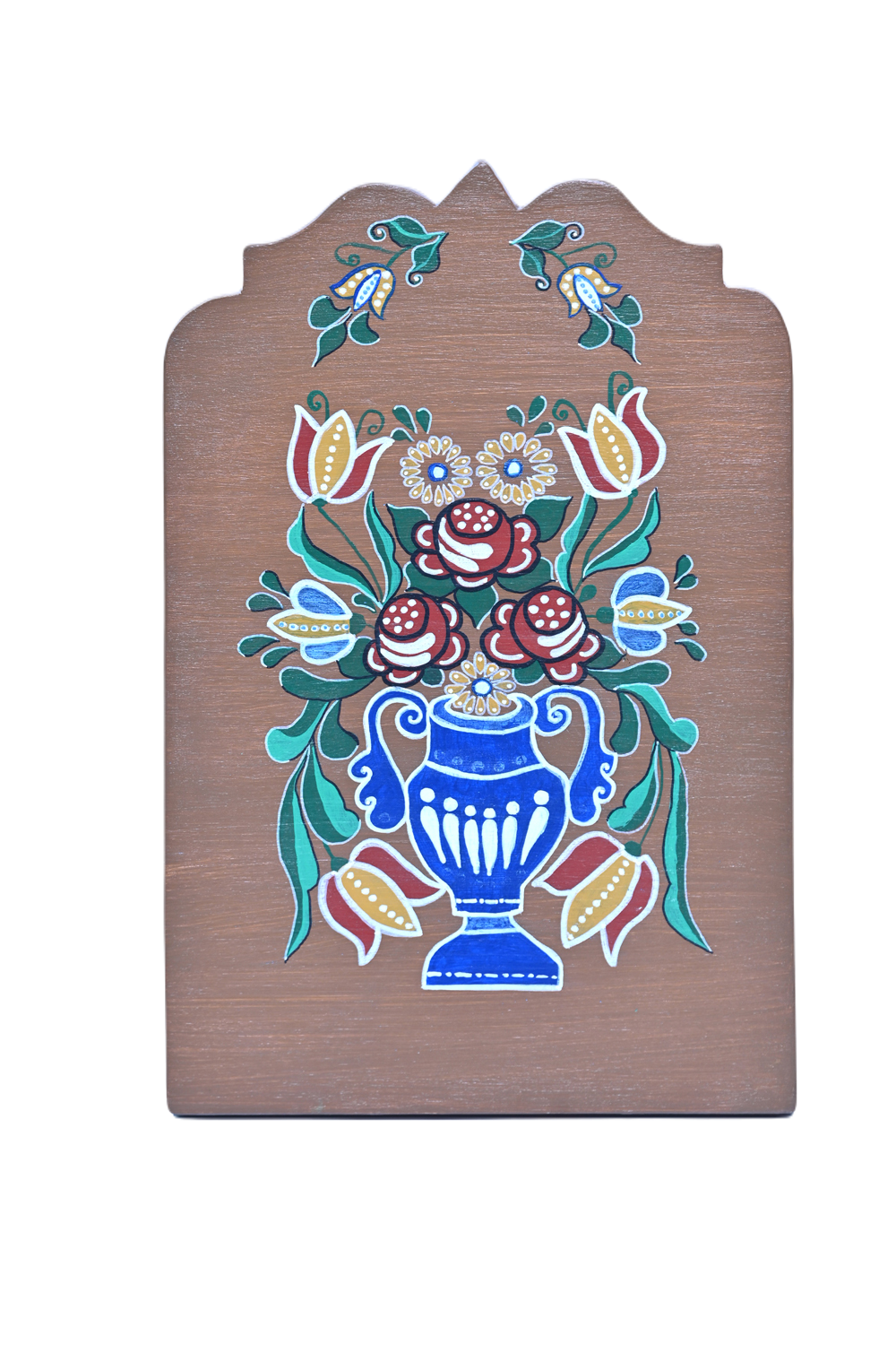 Pictură pe lemn, modelul ornamentului folosește culorile de bază, folosite în tehnica tradițională veche, respectiv roșu, galben, albastru pe un fundal maro. Motivele sunt florale. Poate fi folosit ca tablou decorativ. Realizat în culori Vitex, atât fundalul cât și desenul, lăcuit cu un lac transparent satinat ce conferă un aspect mătăsos, cu durabilitate bună, chiar dacă este expus la soare sau umiditate.