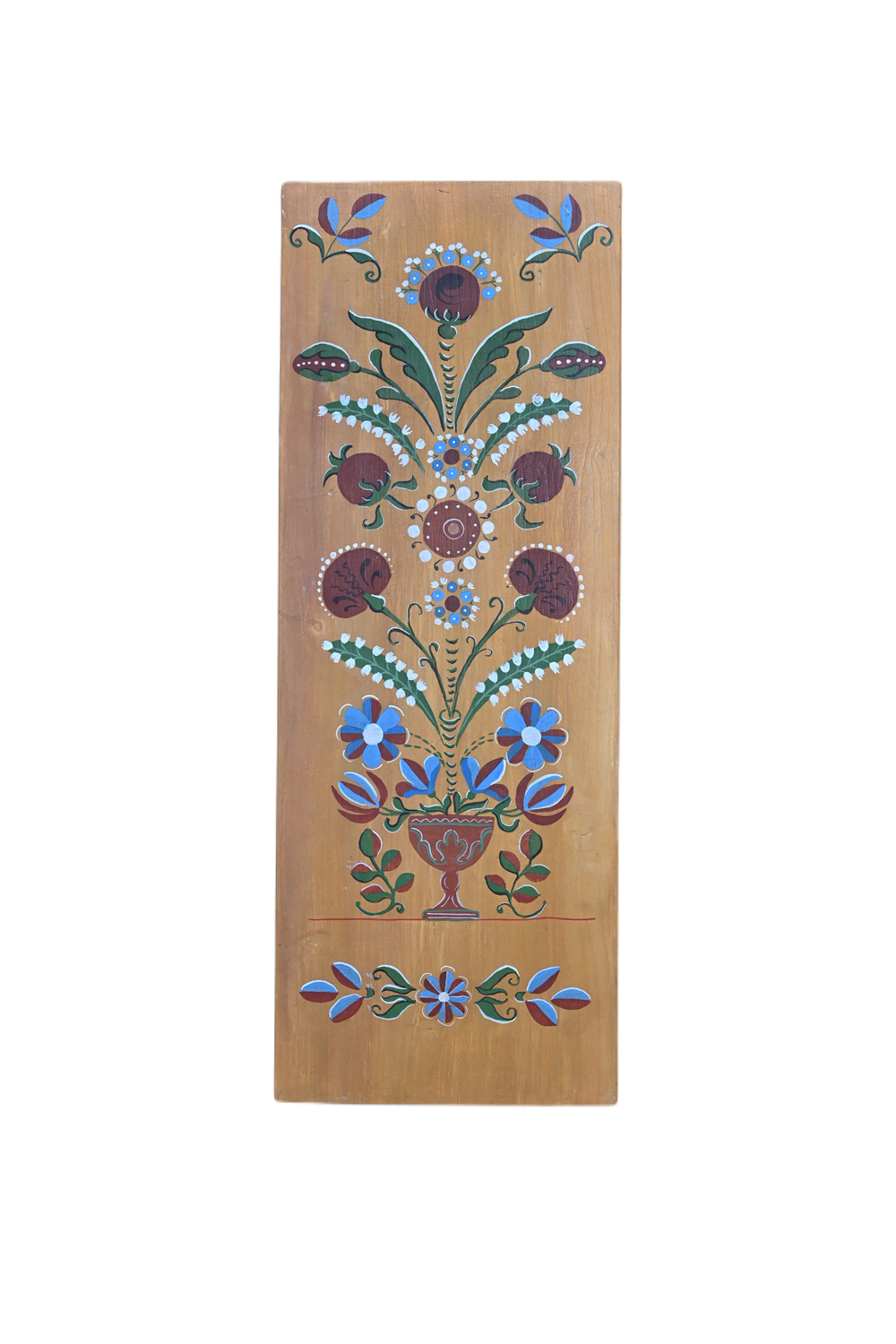 Panou decorativ cu modele de inspirație săsească, își găsește cu ușurință locul ca tablou, pe un perete într-o locuință amenajată în stil tradițional. Suprafața de lemn este pregătită cu clei de oase, grund de ipsos și cretă, pigmenți naturali în amestec cu emulsie de ou. Pictura este lăcuită cu un lac transparent satinat ce conferă un aspect mătăsos, cu durabilitate bună, chiar dacă este expusă la soare sau umiditate.