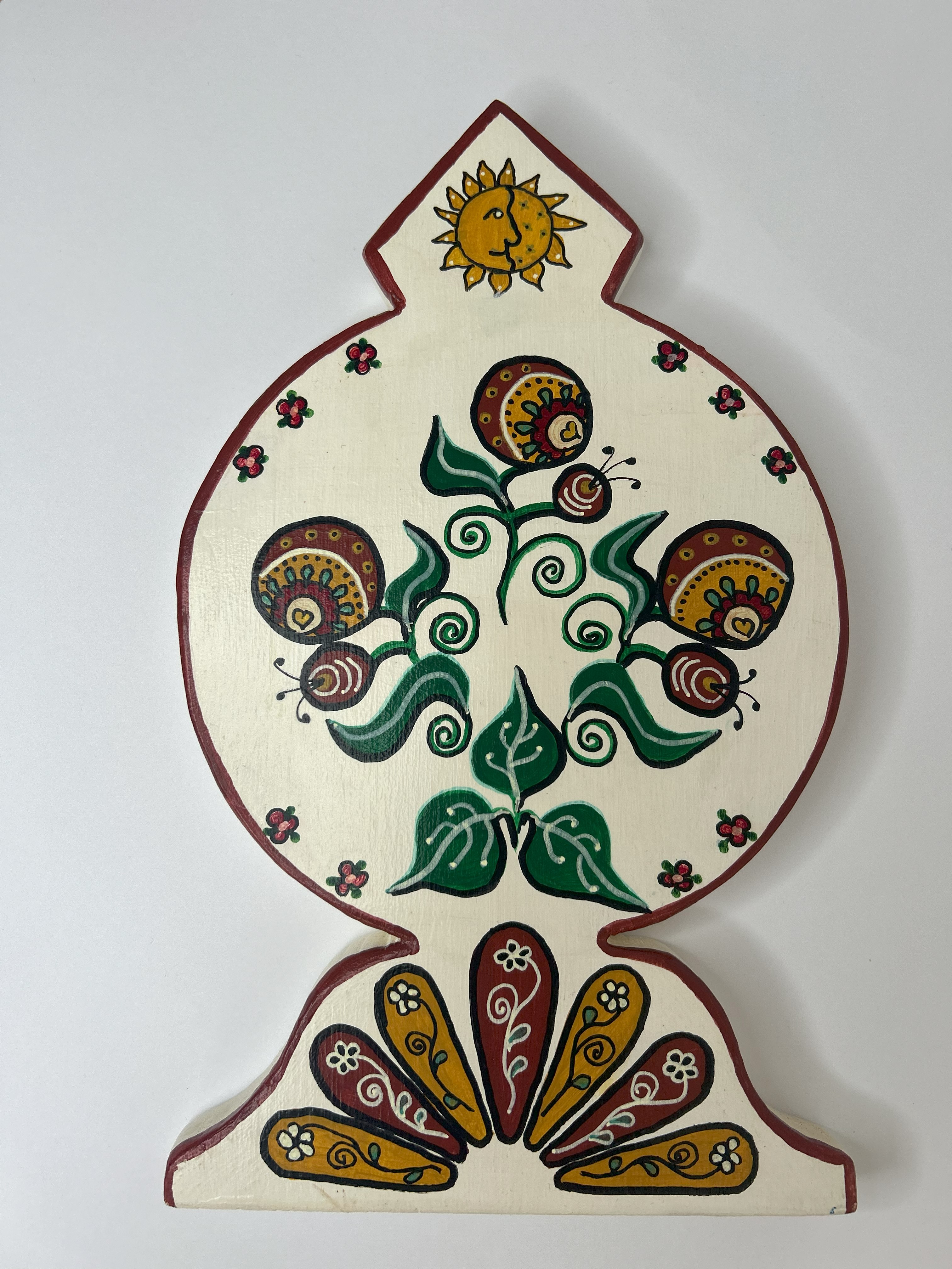 Pictură pe lemn. Produs unicat. Lucrat manual. Culorile folosite sunt albastru, verde, roșu, galben pe fundal alb. Motivele sunt florale.Se livreaza cu agățătoare de perete. Poate fi folosit ca tablou decorativ pe un perete sau pe un raft, caz în care, la cerere, i se poate adăuga un element de stabilitate. Realizat în culori Vitex, atât fundalul cât și desenul. Pictura este lacuită cu un lac transparent satinat ce conferă un aspect mătăsos, cu durabilitate bună, chiar dacă este expusă la soare sau umiditate.