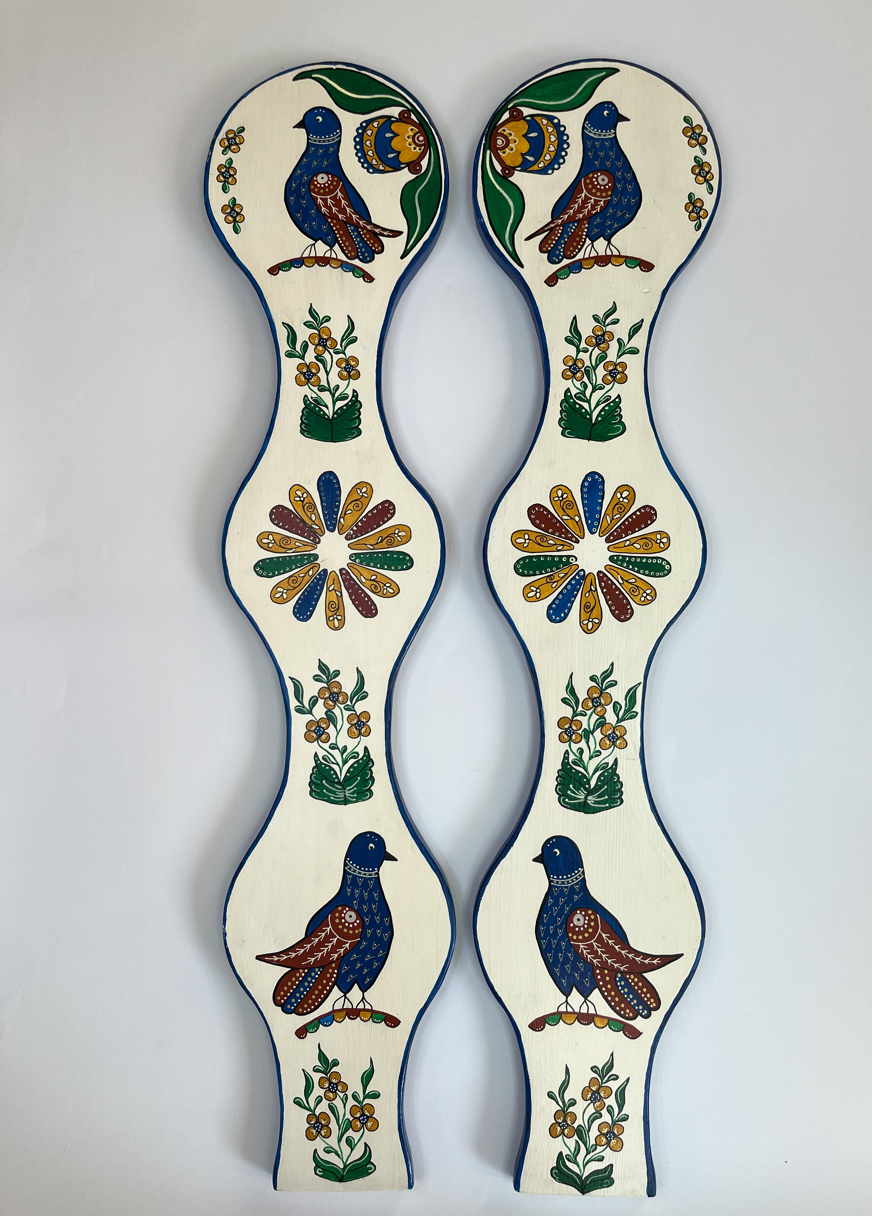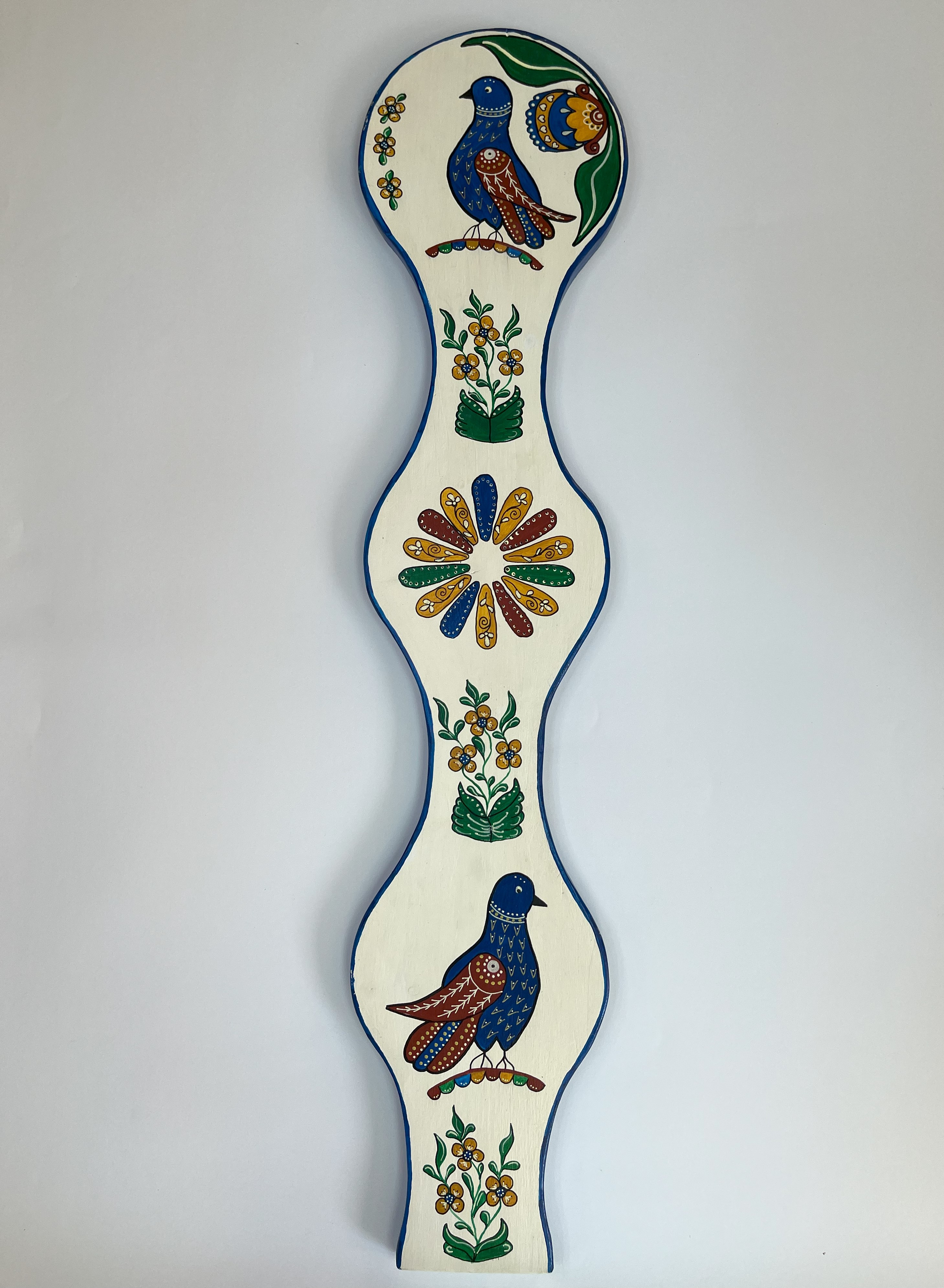 Pictură pe lemn. Produs unicat. Lucrat manual.Culorile folosite sunt albastru, verde, roșu, galben pe fundal alb. Motivele sunt florale și zoomorfe. Poate fi folosit ca tablou decorativ. Se livreaza cu agățătoare de perete. Realizat în culori Vitex, atât fundalul cât și desenul. Pictura este lacuită cu un lac transparent satinat ce conferă un aspect mătăsos, cu durabilitate bună, chiar dacă este expusă la soare sau umiditate.