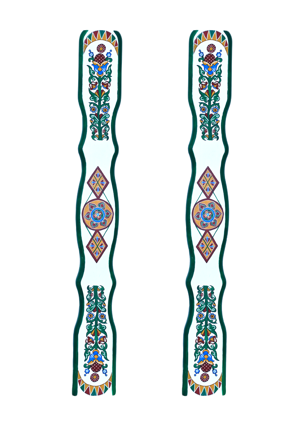 Pictură pe lemn verticală, modelul ormanetului este inspirat din pictură populară rusă. Schema de culori este simplă, predomină roșul, verdele și galbenul sunt folosite in cantități mici pe fundalul alb. Motivele folosite sunt în principal florale combinate cu păsări și semne geometrice, inspirate din arta folk a popoarelor slave. Conturarea marginilor exterioare, în roșu are deasemenea rolul de a individualiza pictură și de a o scoate în evidență oriunde ar fi amplasată. Pot încadra o fereastra vertical sau două ferestre orizontal, după cum pot fi foarte bine expuse și împreună. Realizat în culori Vitex, atât fundalul cât și desenul. Pictura este lacuită cu un lac transparent satinat ce conferă un aspect mătăsos, cu durabilitate bună, chiar dacă este expusă la soare sau umiditate.